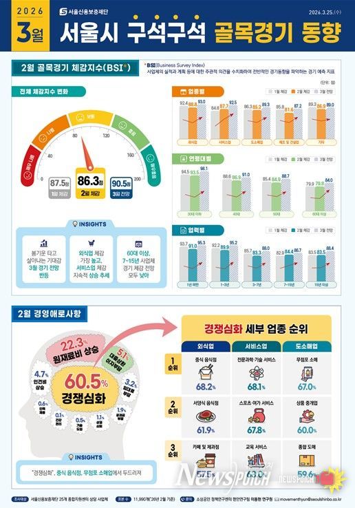 뉴스펀치 박상훈 기자 | 서울신용보증재단이 매월 발간하는'서울시 구석구석 골목경기 동향'이 월별 골목경기 동향에 더해 업종별 매출·소득과 경영애로, 자금 활용까지 분석 범위를 확대했다. 소상공인 체감경기를 다양한 항목으로 진단해 현장 활용도를 높인 것이 특징이다.