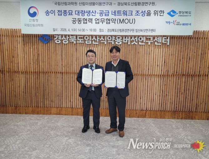 뉴스펀치 박세훈 기자 | 경상북도산림환경연구원은 임산식약용버섯연구센터에서 1일 산림청 국립산림과학원과 ‘송이 접종묘 대량생산·공급 네트워크 조성’을 위한 업무협약(MoU)을 체결했다.