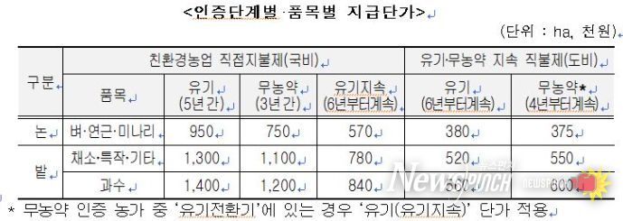 무농약은 3년(3회), 유기는 5년(5회) 인증단계별·품목별 지급단가는 ha당 유기농은 95만원~140만원, 무농약은 75~120만원으로 지급된다. 또한 저농약 지급 이력은 제외하여 친환경 인증 농가의 직불금 수혜 기회를 확대했다.
