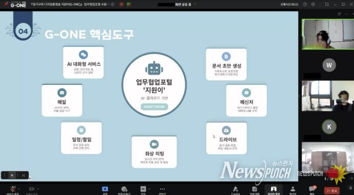 이번 교육은 경기도교육청에서 교직원의 업무경감을 위하여 야심 차게 추진 중인 업무협업포털 ‘지원이(G-ONE)’의 현장 안착을 지원하고, 디지털 기술을 활용한 행정 업무의 효율성을 높이기 위해 마련됐다. 아울러, 교육은 ‘지원이(G-ONE)’플랫폼 내 화상회의 기능인 ‘지원이(G-ONE) 미팅’을 통한 실시간 온라인 방식으로 진행됨에 따라 ‘지원이(G-ONE)’의 기능을 보다 현실감 있게 전달하는 계기가 됐다.