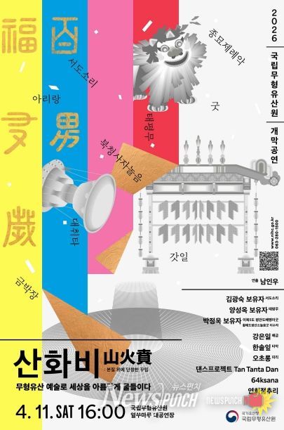 뉴스펀치 정홍균 기자 | 국가유산청 국립무형유산원(원장 박판용)은 '2026년 개막공연 산화비(山火賁)'(부제: 무형유산 예술로 세상을 아름답게 물들이다)를 오는 4월 11일 오후 4시, 국립무형유산원 얼쑤마루 대공연장(전북 전주시)에서 개최한다.