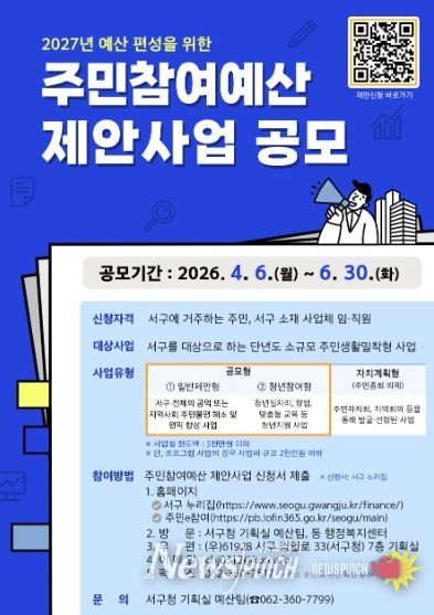 뉴스펀치 김용희 기자 | 광주광역시 서구가 실질적인 주민주권 강화를 위해 ‘주민참여예산 제안사업 공모’를 6월 30일까지 진행한다. 이번 공모는 내년도 예산에 반영할 주민 제안사업을 모집하는 것으로 이달 6일부터 접수를 시작한다.