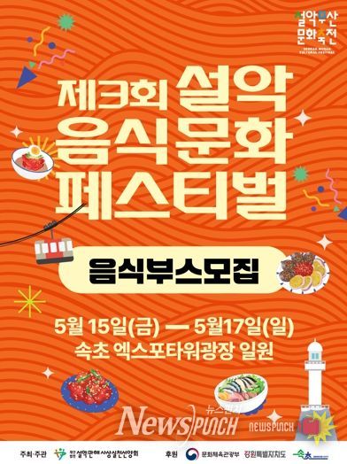 제3회 설악음식문화페스티벌은 지역 특산물을 활용한 음식과 디저트, 음료 등을 선보이는 먹거리 축제로 총 25개 팀의 부스를 모집한다. 모집 기간은 4월 1일부터 4월 26일까지이며, 참여 업체에는 축제 기간 판매와 홍보 기회가 제공된다.