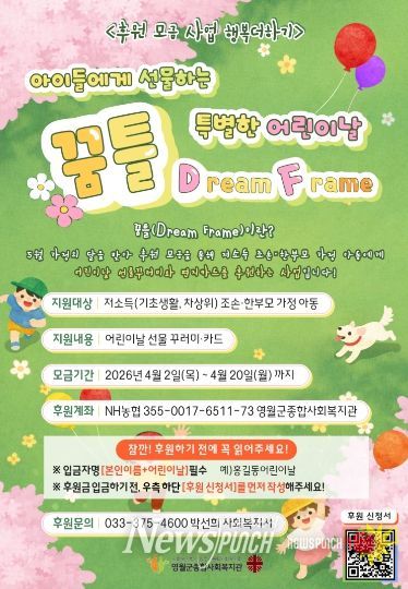 뉴스펀치 조평훈 기자 | 영월군종합사회복지관은 다가오는 5월 어린이날을 맞아 저소득 조손·한부모 가정 아동을 위한 ‘행복 더하기-꿈틀(Dream Frame)’ 후원 모금 사업을 추진한다.