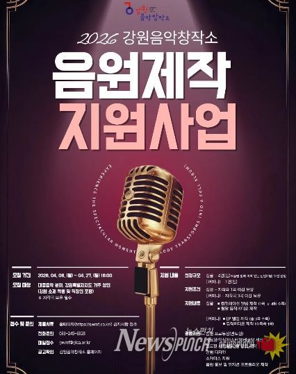 뉴스펀치 조평훈 기자 | 강원음악창작소가 오는 27일까지 도내 역량 있는 뮤지션을 발굴하기 위해 ‘2026년 음원제작 지원사업’의 참여자를 모집한다.