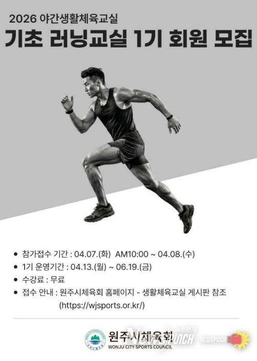 뉴스펀치 조평훈 기자 | 원주시와 원주시체육회는 4월 7일부터 8일까지 ‘2026년 제1기 야간생활체육교실 기초 러닝교실’ 수강생을 모집한다.
