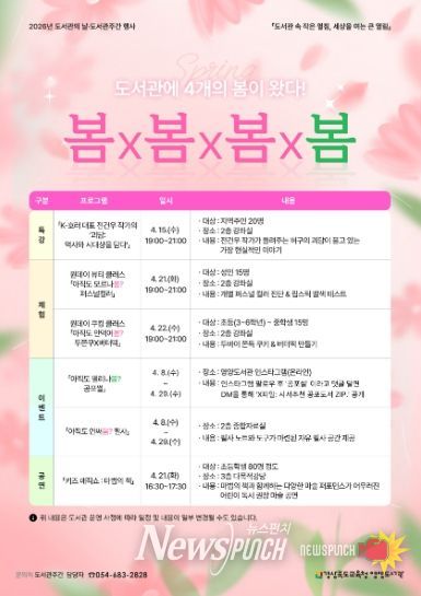 뉴스펀치 박세훈 기자 | 경상북도교육청 영양도서관은 2026년 도서관의 날·도서관주간을 맞아 ‘도서관 속 작은 펼침, 세상을 여는 큰 열림’을 공식 표어로 지역주민을 위한 강연, 체험, 공연, 이벤트를 운영한다.
