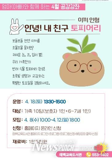 뉴스펀치 조평훈 기자 | 태백교육도서관은 4월 18일 오후 1시 30분 태백교육도서관 1층 다목적실에서 6~7세 자녀와 부모로 구성된 가족 10팀, 총 20명을 대상으로 4월 공감강좌 ‘안녕! 내 친구 토피어리’를 운영한다.