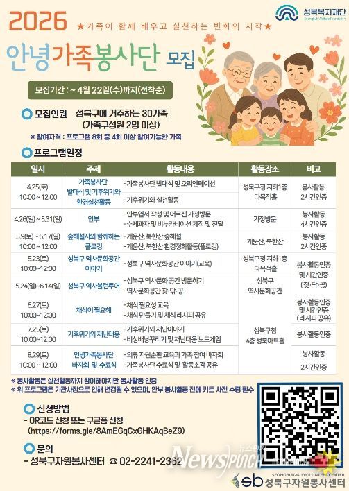 뉴스펀치 박상훈 기자 | 성북복지재단이 오는 4월 22일까지 ‘2026년 안녕가족봉사단’ 참여 가족을 모집한다.