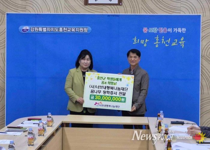 뉴스펀치 조평훈 기자 | 강원특별자치도홍천교육지원청은 4월 7일 오후 6시, 홍천교육지원청에서 (사)너브내행복나눔재단 및 홍천군가족센터와 함께 ‘꿈나무 장학금 장학증서 전달식’을 개최했다.