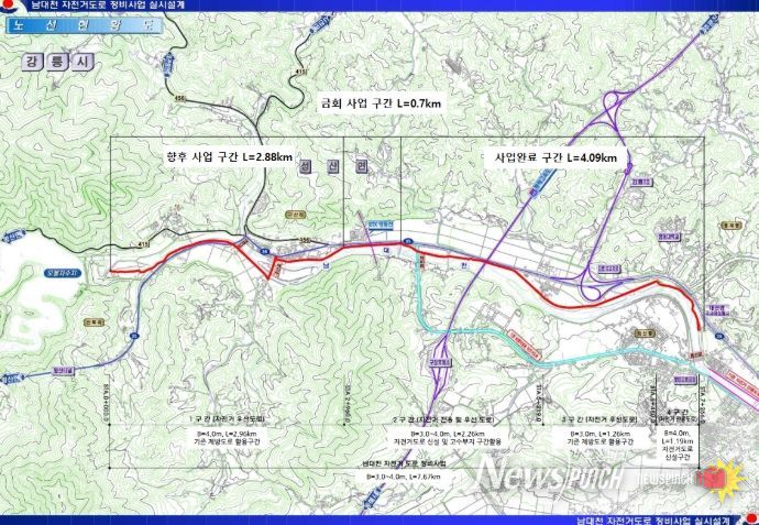 강릉시는 지난해까지 회산교~여전교(4.09㎞) 구간을 우선 개설한 데 이어 오는 4월 성산면 구산강변길(0.7㎞) 구간 착공을 시작으로 연내 총 3.58㎞를 완료하여 전체 노선(7.67㎞)을 차질없이 개통할 예정이다.
