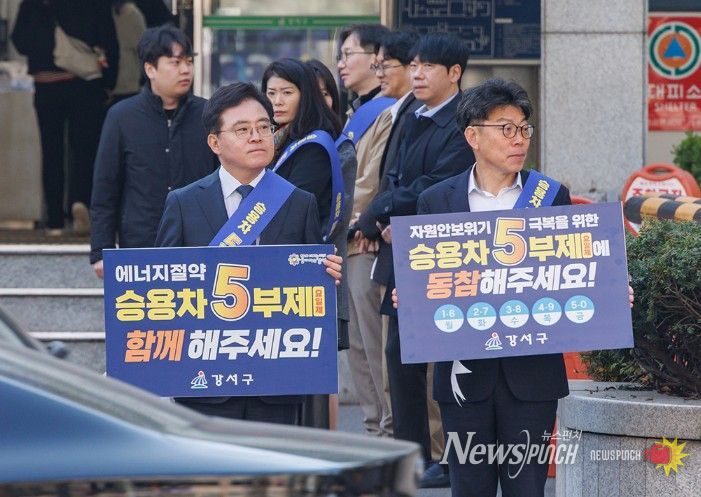 뉴스펀치 박상훈 기자 | 서울시 강서구 진교훈 구청장이 공영주차장 차량 5부제 첫날인 8일 주민들의 자발적인 참여를 독려하기 위해 캠페인을 펼쳤다.