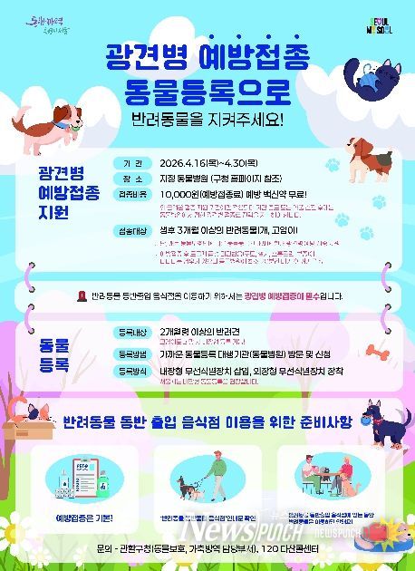 뉴스펀치 박상훈 기자 | 서울 은평구는 오는 16일부터 30일까지 관내 지정 동물병원에서 ‘봄철 광견병 예방접종’을 실시한다고 밝혔다.