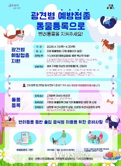 구는 오는 4월 16일부터 30일까지 관내 지정 동물병원 35개소에서 ‘광견병 예방접종’을 실시한다. 광견병은 치사율이 높고 사람에게도 전염될 수 있어, 가족과 이웃의 안전을 위해 매년 1회 예방접종을 권고하고 있다.
