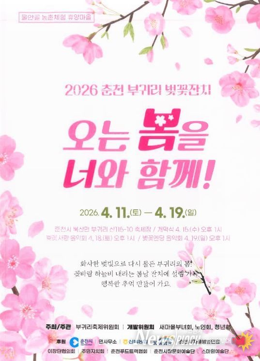 춘천시에 따르면 부귀리 산115-10번지 물안골 농촌체험휴양마을 일원에서 ‘2026 춘천 부귀리 벚꽃잔치’가 오는 11일부터 19일까지 9일간 펼쳐진다.