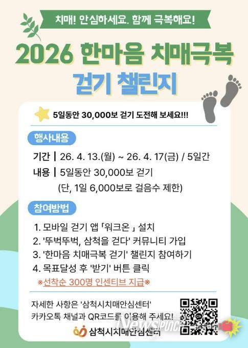 뉴스펀치 조평훈 기자 | 삼척시보건소 치매안심센터가 치매 예방에 좋은 ‘걷기’를 실천해 치매에 대한 인식을 개선하고 치매 극복을 기원하기 위해 오는 4월 13일부터 17일까지 5일간 '2026 한마음 치매극복 걷기 챌린지'를 운영한다.