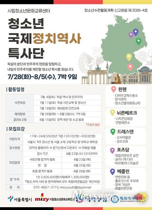 뉴스펀치 박상훈 기자 | 서울시 청소년 12명이 올여름 독일로 떠난다. 서울시는 청소년이 직접 정책을 제안하고 예산 편성에도 참여하는'청소년자율예산제'의 첫 번째 사업인'청소년 국제정치역사특사단'참가자를 4월 13일부터 22일까지 모집한다.