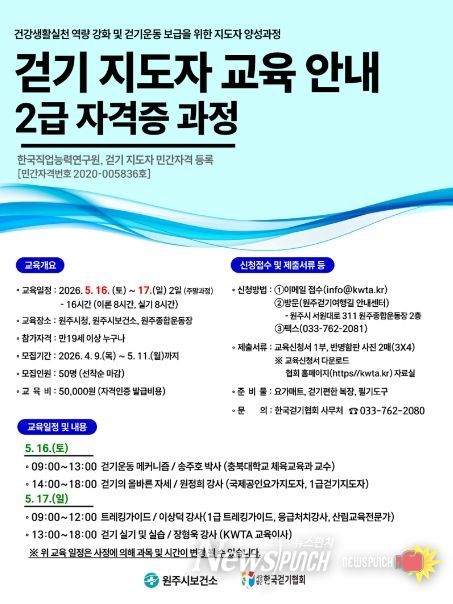 뉴스펀치 조평훈 기자 | 원주시보건소는 시민들의 올바른 걷기 문화 확산을 위해 5월 11일까지 상반기 ‘걷기지도자 2급 과정’ 수강생 50명을 선착순으로 모집한다.