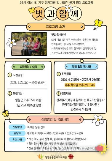 뉴스펀치 조평훈 기자 | 영월군종합사회복지관은 관내 65세 이상 1인 가구 어르신을 대상으로 정서 지원과 교류 확대를 위한 프로그램 ‘벗과 함께’ 참여자를 모집한다.