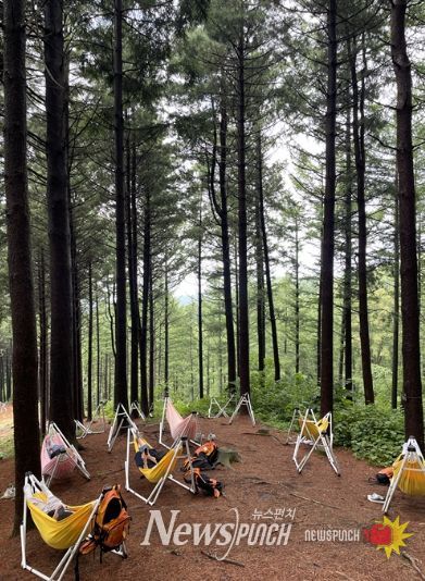 세부 프로그램으로는 ▲리듬 괄사 테라피 ▲밴드 스트레칭 ▲맨발숲길 걷기 등 신체 활력 증진 활동과 ▲해먹 체험 ▲싱잉볼 명상 ▲숲풍경 컬러링 등 오감을 자극하는 산림치유 코스가 다채롭게 구성됐다.