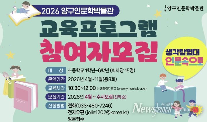 뉴스펀치 조평훈 기자 | 양구인문학박물관이 오는 4월 25일부터 11월 21일까지 관내 초등학생들을 대상으로 어린이 인문 교육 프로그램인 ‘생각탐험대, 인문 속으로’를 운영한다.