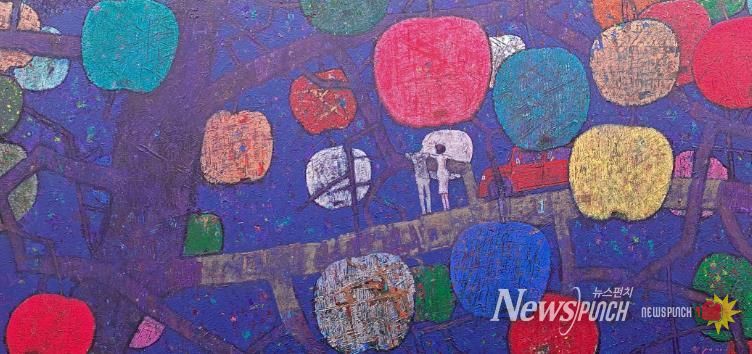 작가는 사과를 생명과 우주가 응축된 존재로 바라보며, 둥근 하늘과 둥근 땅 사이에 머무는 상징적 형상으로 확장한다.