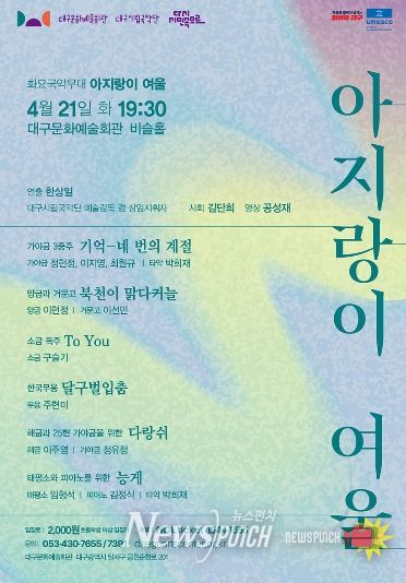 뉴스펀치 조평훈 기자 | 대구시립국악단 화요국악무대 '아지랑이 여울' 공연이 4월 21일 저녁 7시 30분 대구문화예술회관 비슬홀에서 펼쳐진다.