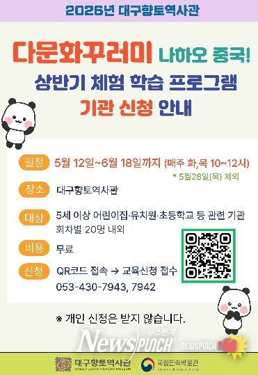 뉴스펀치 조평훈 기자 | 대구문화예술진흥원 박물관운영본부 소속 대구향토역사관에서는 5월 12일부터 6월 18일까지 매주 화·목요일 10시~12시에 중국 다문화꾸러미 체험학습을 11회 운영하며, 4월 15일부터 어린이집·유치원 등 참여 기관을 모집한다.