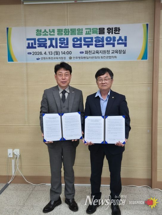 뉴스펀치 조평훈 기자 | 강원특별자치도화천교육지원청은 4월 13일 화천교육지원청 교육장실에서 민주평화통일자문회의 화천군협의회와 청소년 평화통일교육을 위한 교육지원 업무협약을 체결했다.