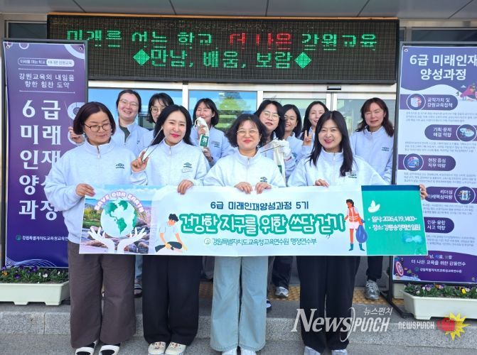 뉴스펀치 조평훈 기자 | 강원특별자치도교육청교육연수원은 4월 13일, ‘6급 미래인재양성과정 5기’ 연수생들과 함께 지역 생태 자산의 가치를 보존하고 기후 위기 대응을 실천하기 위한 ‘건강한 지구를 위한 환경봉사 쓰담걷기’ 프로그램을 운영했다.
