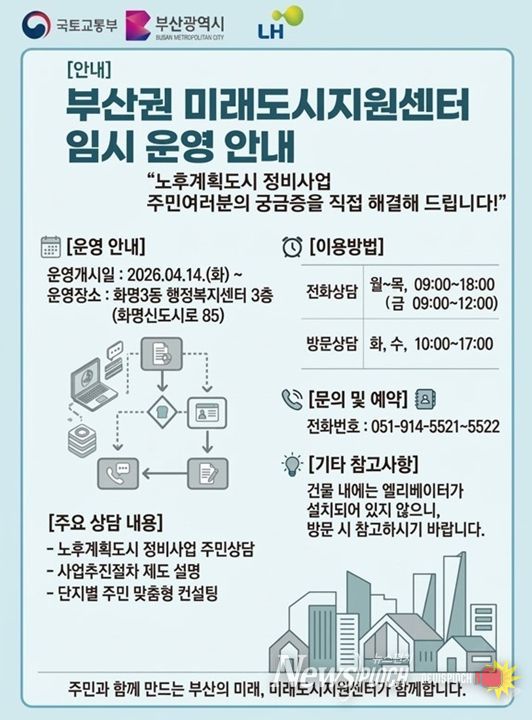 뉴스펀치 김윤걸 기자 | 부산시는 노후계획도시 정비사업의 본격화에 대응해, 주민 상담과 맞춤형 컨설팅을 전담하는 비수도권 최초의 '부산권 미래도시지원센터'를 오늘(14일)부터 임시 운영한다고 밝혔다.