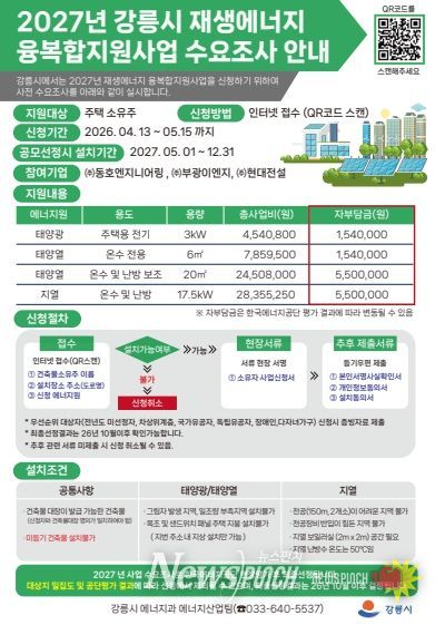 뉴스펀치 조평훈 기자 | 강릉시는 기후위기 대응과 에너지 자립도 향상을 목표로 기후에너지환경부 주관 '2027년 재생에너지보급지원(융·복합지원사업)' 공모 신청을 위해 사전 수요조사를 한다.