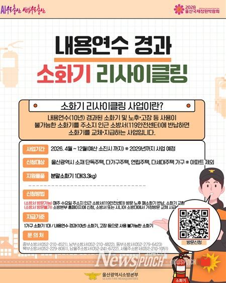 뉴스펀치 김윤걸 기자 | 울산소방본부는 이달부터 ‘내용연수 경과 소화기 교체(리사이클링)’ 사업을 추진한다고 밝혔다.