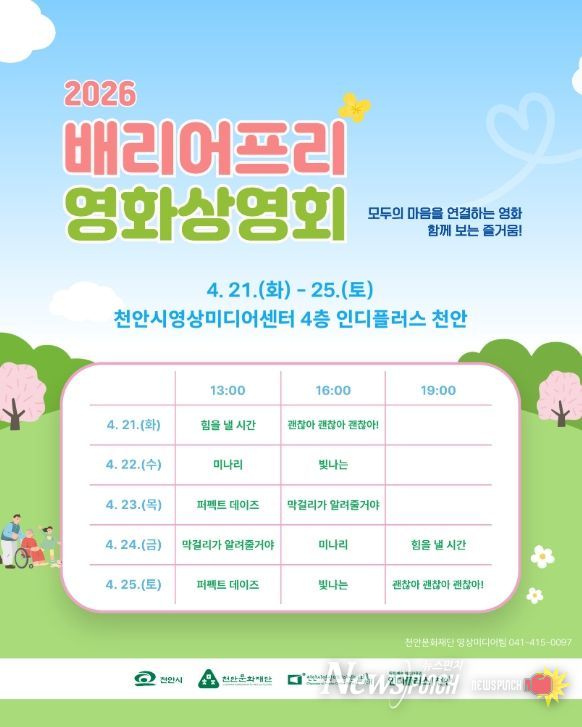 뉴스펀치 이현승 기자 | 천안문화재단은 이달 21~ 25일 천안시영상미디어센터에서 ‘배리어프리 영화상영회’를 운영한다고 14일 밝혔다.