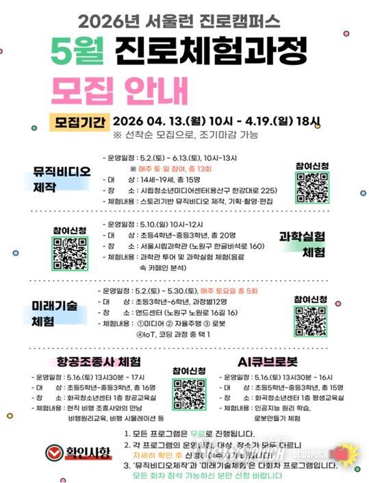시립청소년미디어센터에서는 5월 2일~6월 13일 총 13회 과정으로 중‧고등학생 15명 대상 뮤직비디오 기획부터 촬영, 편집까지 콘텐츠 제작 전 과정을 통해 기획력과 창의적 표현 역량을 키워주는 프로그램이 운영된다. 시립노원청소년미래진로센터(앤드센터)에서는 5월 2일부터 매주 토요일 총 5회 초등 3~6학년 48명(12명×4개 과정) 대상 자율주행, 로봇, IoT코딩, 미디어 중 하나를 선택해 체험하는 과정이 운영된다. 화곡청소년센터는 5월 16일 초등 5학년~중등 3학년 31명 대상 현직 조종사와 함께 비행 원리를 배우고 시뮬레이션으로 조종을 체험하거나 AI 큐브로봇 제작 과정에 참여하는 항공조종사 체험을 운영하며, 시립과학관은 5월 10일 초‧중학생 대상 과학관 전시 해설, 음료 속 카페인 분석 등 생활 속 과학 원리를 실험으로 확인하는 프로그램을 제공한다.