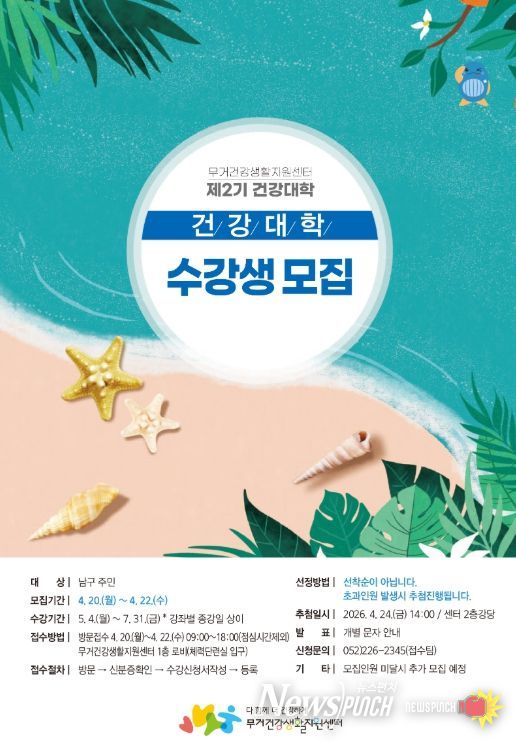 뉴스펀치 김윤걸 기자 | 무거건강생활지원센터는 지역주민의 건강증진을 위한 ‘2026년 제2기 건강대학’ 수강생을 오는 20일부터 22일까지 모집한다고 14일 밝혔다.