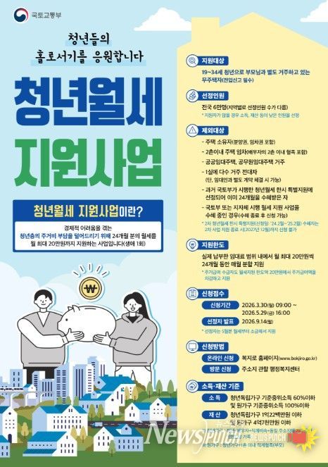 신청 기간은 올해 3월 30일부터 5월 29일 오후 4시까지 수시 접수로 진행되며, 신청은 온라인과 오프라인 모두 가능하다. 온라인은 청년 본인이 ‘복지로’에 접속해 신청할 수 있으며, 오프라인은 관할 시·군청 또는 읍·면·동 행정복지센터에 방문 신청하면 된다.