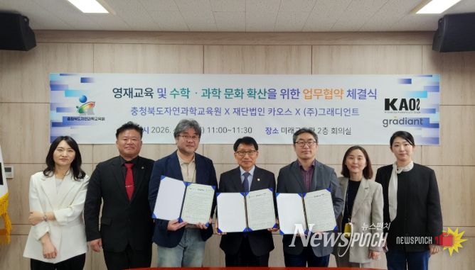 뉴스펀치 이현승 기자 | 충청북도교육청 직속기관 자연과학교육원은 14일, 본원에서 (재)카오스(이사장 이기형), ㈜그래디언트(대표이사 남인봉)와 함께 수학‧과학교육 문화 확산과 영재교육의 질적 향상을 위한 업무협약을 체결했다.