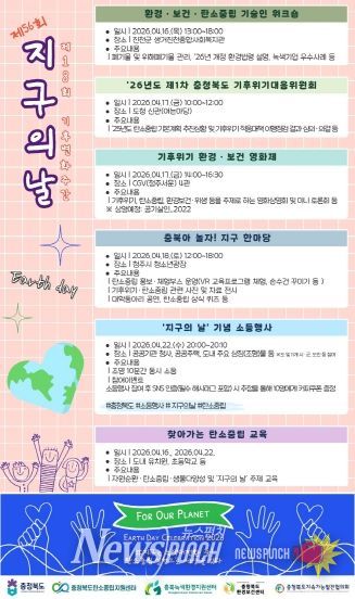 뉴스펀치 이현승 기자 | 충북도가 제56주년 ‘지구의 날(4.22.)’을 맞아 오는 4월 16일부터 22일까지를 ‘기후변화주간’으로 지정하고, 도민과 함께하는 다양한 행사를 추진한다.