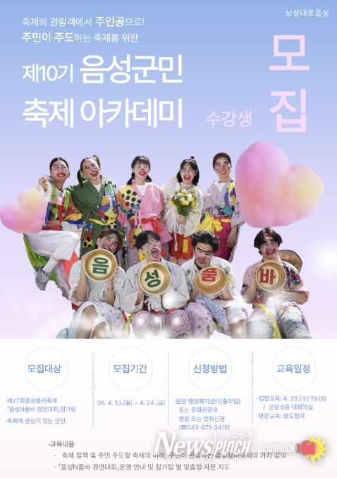 뉴스펀치 이현승 기자 | 음성군은 주민이 직접 음성 품바의 새로운 주인공이 되어 무대를 완성해 가는 주민 주도형축제를 실현하기 위해 제10기 음성군민 축제 아카데미의 첫 단추인 ‘주민 주도형 교육’ 수강생을 모집한다고 밝혔다.