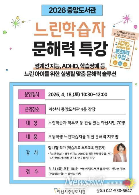 뉴스펀치 이현승 기자 | 아산시 중앙도서관은 오는 18일(토) 오전 10시 30분부터 12시까지 중앙도서관 4층 강당에서 '느린학습자 문해력 특강'을 운영한다.