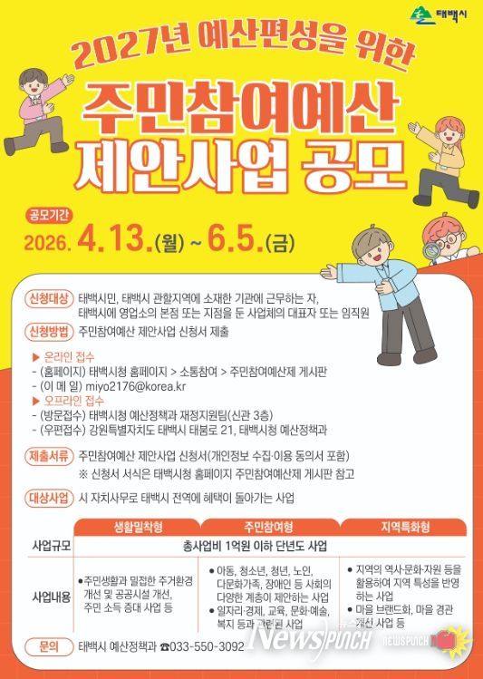 뉴스펀치 조평훈 기자 | 태백시는 2027년도 예산 편성을 위한 주민참여예산 제안사업 공모를 오는 6월 5일까지 진행한다고 밝혔다.