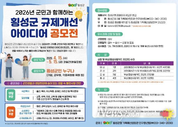 뉴스펀치 조평훈 기자 | 횡성군이 군민의 일상생활과 생업현장에서 겪고 있는 각종 불합리한 규제를 개선하기 위해 ‘2026년 횡성군 규제개선 아이디어 공모전’을 개최한다.