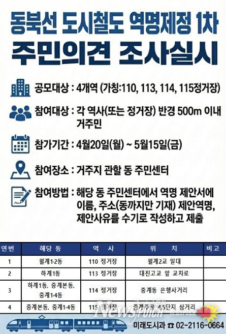 1차 인근 주민의 의견 수렴은 4월 20일부터 5월 15일까지 4주간 진행된다. 역명 제정이 필요한 ▲110 정거장(월계1동, 월계2동), ▲113 정거장(하계1동), ▲114 정거장(하계1동, 중계본동, 중계1동, 중계4동), ▲115 정거장(중계본동, 중계1동, 중계4동) 주민들이 참여할 수 있다. 위 해당하는 동 주민들은 본인이 거주하는 동 주민센터를 통해 의견을 제출하면 된다.