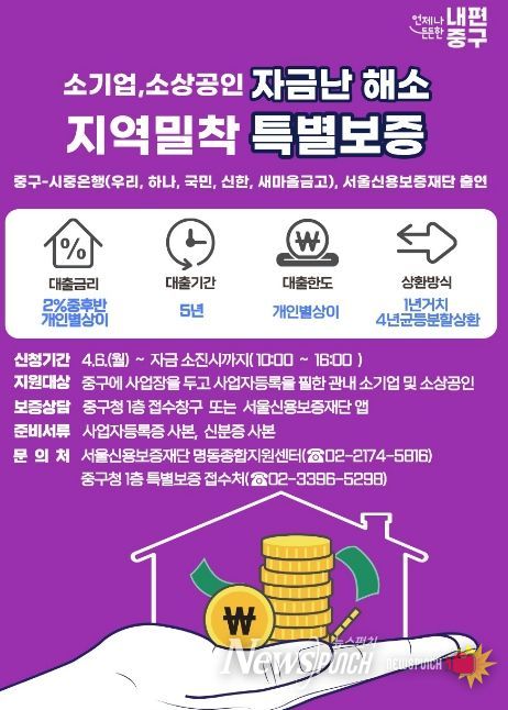 뉴스펀치 박상훈 기자 | 서울 중구가 중동사태 등 대내외 경제 불확실성 속에서 어려움을 겪는 소기업·소상공인을 위해 자금 지원에 나선다. 구는 이달부터 무담보 특별신용보증(이하 특별보증) 350억원과 2분기 중소기업육성기금 융자 20억원 규모를 지원한다.