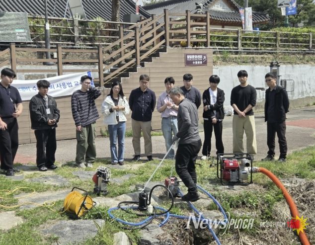 이번 교육은 2인 1조로 편성되어, 전문가의 시범 후 엔진펌프와 수중펌프 등 장비를 직접 가동해 보는 실습 위주로 진행됐다.