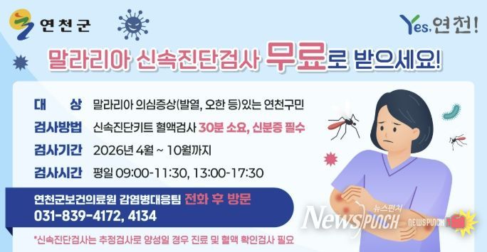 뉴스펀치 박상훈 기자 | 연천군보건의료원은 말라리아 유행 시기를 앞두고 지역 내 감염 확산을 사전에 차단하기 위해 4월부터 무료 신속진단검사 운영을 본격화했다고 밝혔다.
