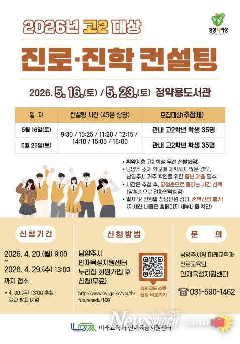 뉴스펀치 박상훈 기자 | 남양주시는 오는 20일부터 29일 오후 1시까지 관내 고등학교 2학년 학생과 학부모를 대상으로 ‘고2 맞춤형 진로·진학 컨설팅’ 참여자를 모집한다고 15일 밝혔다.