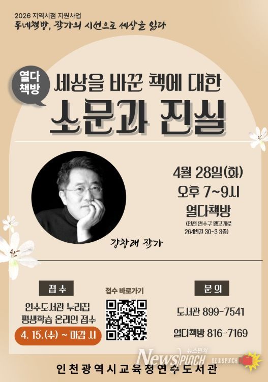 특강은 4월 28일 저녁 7시 ‘열다책방’에서 진행되며, 참여를 희망하는 인천 시민은 4월 15일부터 연수도서관 누리집에서 신청할 수 있다.