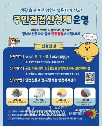 시 관계자는 “주민점검신청제는 시민의 눈높이에서 위험 요소를 제거할 수 있는 소중한 기회”라며, “시민 여러분의 작은 관심이 큰 사고를 막는 첫걸음인 만큼 적극적인 관심과 참여를 부탁드린다”라고 말했다.